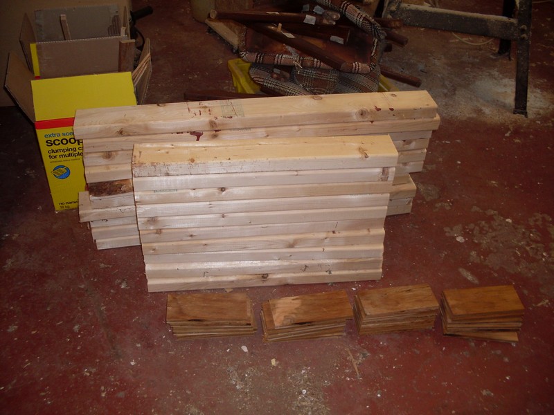 So off the the workshop where I cut some 2 x 4 to 10 pieces 3 feet long and 10 pieces 2 feet long. I also cut some scrap 1/2" plywood into 20 pieces each 7" x 3 1/2". ]