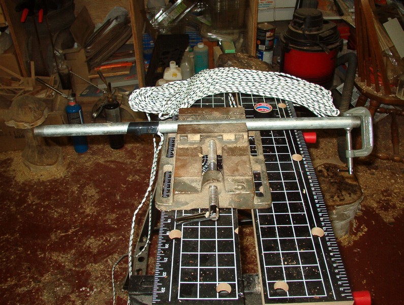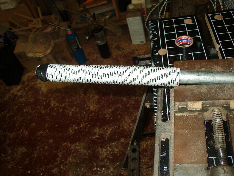 | Then I wrap the handle. The drill vise is not tight, it merely keeps the handle from rolling along the bench top. A couple of scrap boards clamped in place would be fine. |