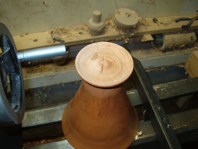 While there is still lots of wood supporting the piece I begin to sand the base exterior. The tool marks at the foot will need a bit more work.