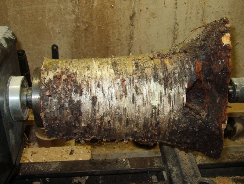 Beginning from the head stock I start to shape the piece. Wear a glove until the bark is gone. Birch will leave long strands of bark that will swing around and hit your hand. Not only will it sting, it may surprise you into a cut will cause a catch or otherwise hurt the piece.