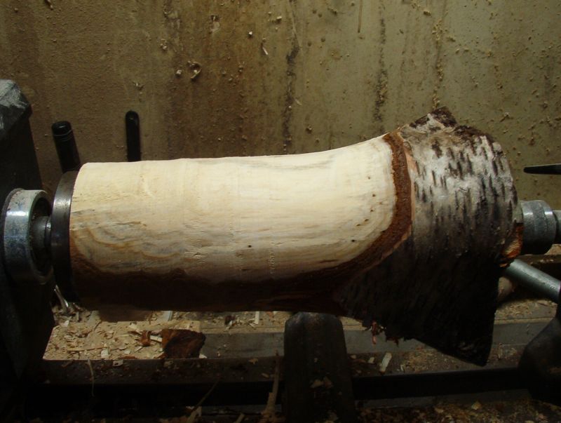 The tailstock end is flattened in preparation for a face plate. I find that this is easier than trying to do a 90° cut with chain saw.