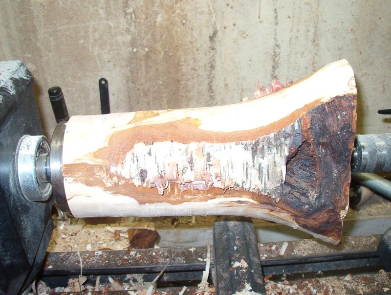 After a few cuts it is evident that more needs to come off the sides. Marks like this are helpful as much of the lower material will be left in place as the interior cuts begin so as to leave a stabilizing mass that will help to absorb vibration. The lines help to visualize the final look and thus the amount that needs to be cut away inside.