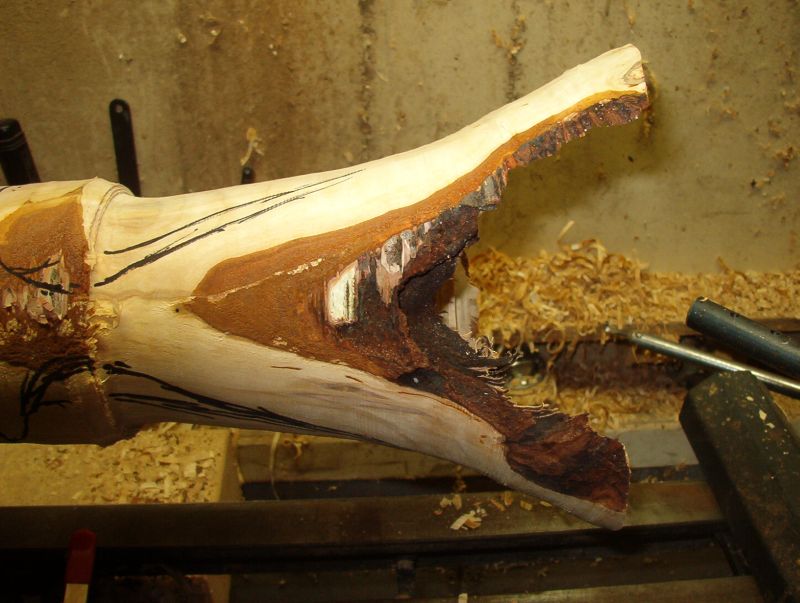 So far, at least on this side, I am following the line of the bark down the side and it looks alright, but I am beginning to wonder if the stem of this piece should not be a lot narrower? A few lines drawn in confirm the suspicion.