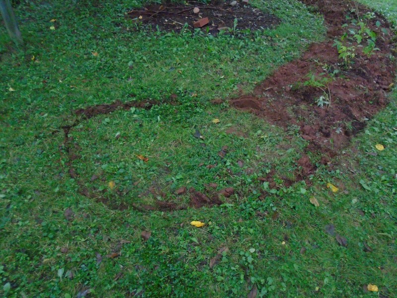 It is hard to see here but I have outlined the area to be dug with a shovel by just driving it into the soil. As soon as I get the ok from my wife I can start digging. If it needs to be changed the interruption to the lawn is minimal and in a week's time you would not be able to see where I marked.