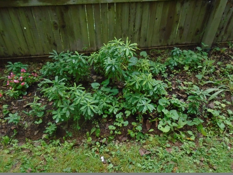 For that matter, since I had moved both bushes to the fence, about six feet further west along the fence is another nursery. The two larger and older bushes took a beating in a ice storm last year and I pruned them hard to remove the damage. They are doing extremely well. This is the same plant from another view and you can see how the young ones have grown around the mother. The oldest are wbout two years old. You can see the slightly softer green on the new growth of the mother plant here.