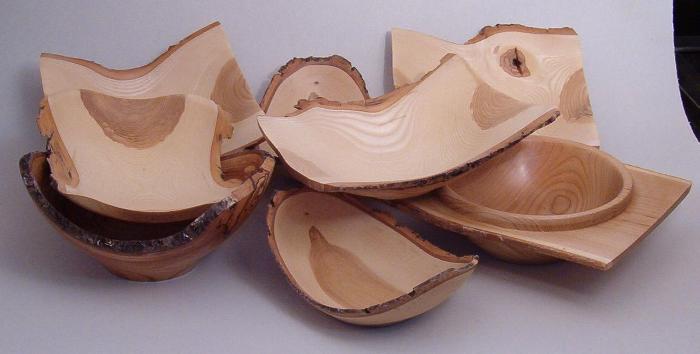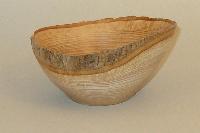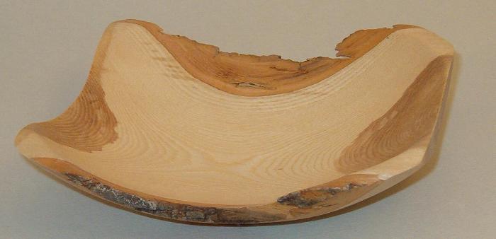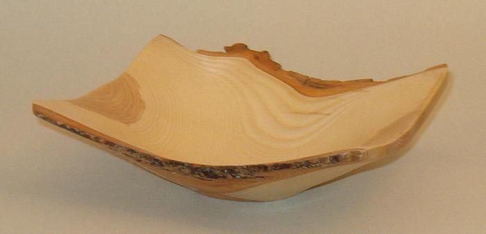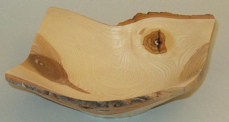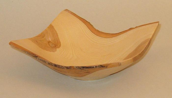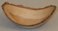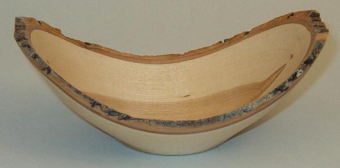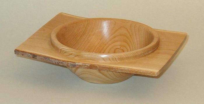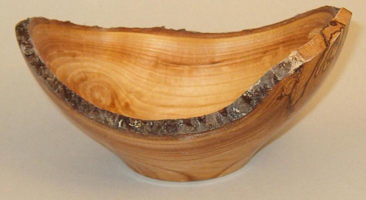 One of the first pieces is a natural edged bowl in pin cherry, about 6"l x 4.5"w x 3"h. There is a distinctive grain due to the limb which was growing from the right end.