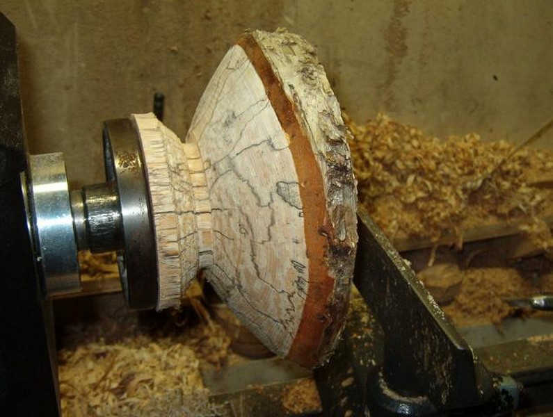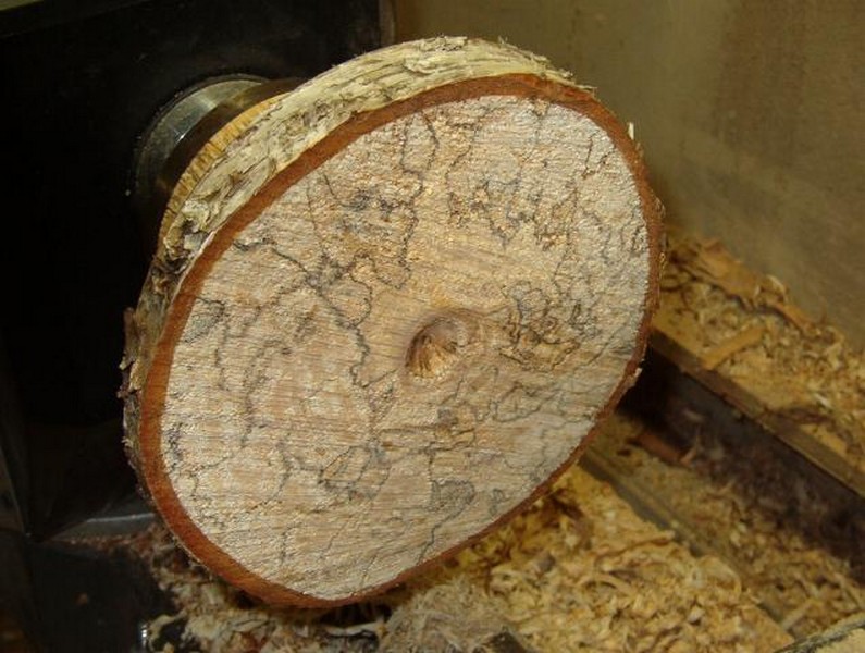 The inside of the bowl is turned away. Even though I use a hook tool for the task, there are few shavings due to the nature of the spalting of this wood.