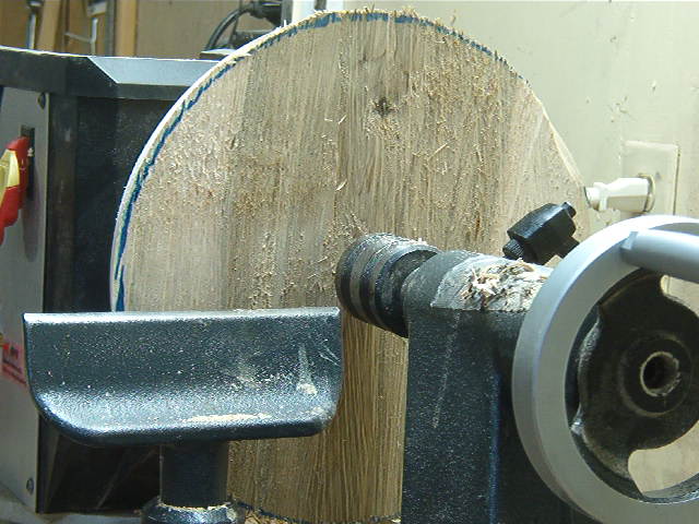 | I was going to use the shorter tool rest but I have changed my mind and use the longer one as I flatten the top of the bowl, working from outside to center in a series of small cuts. The Oland tool is almost flat as I move it into the wood. Remove any pith that has been left in the piece and flatten the face, leaving about 1 1/2" to 2" in center as a tenon. |   |