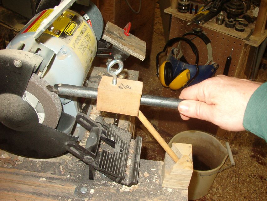 The jig consists of those holders and a movable arm to pivot the tool. You can see that the arm is adjusted with a bolt in a slot. I keep meaning to change to a thumscrew but this works so well I have never bothered. Set the distance for the tool to protrude from the holder, tighten the eyebolt (cheaper than thumscrews and have a larger gripping surface for your fingers), set the end of the holder rod in the pivot, rock and turn. I have not timed it but I am probably back at the lathe with a sharp tool in less than a minute. | |