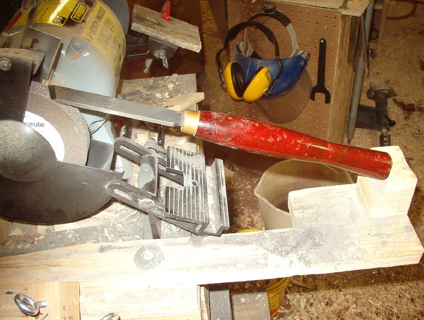 I removed the grinding table that came on the grinder and replaced it with a home made sharpening jig. Jigs are great for reproducing a grind time after time. They let you get a consistent edge and bevel and get back to work. While I started by learning to freehand grind, I am better with a jig and use it consistently. Having said that, parting tools, scrapers and skews are easily sharpened by hand because they are straight edges or simple curves.