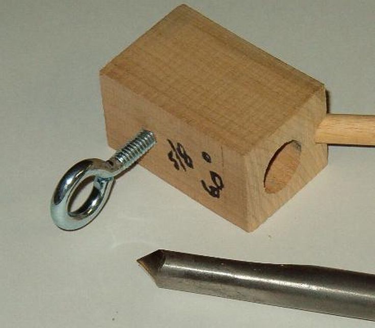 Here is a 60 degree holder and the typical spindle gouge grind it gives. I did not mark the gouge size on the holder as I seldom use spindle gouges and use this holder for 1/4" to 1/2" spindle gouges. I could do the same for the bowl gouges or Oland tools but prefer to have one for each size shaft as I use the Oland tools a lot and am too lazy to want to keep turning the eye bolt in and out. |