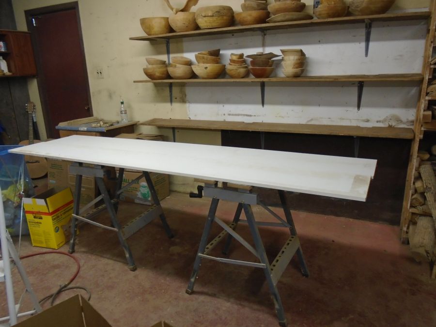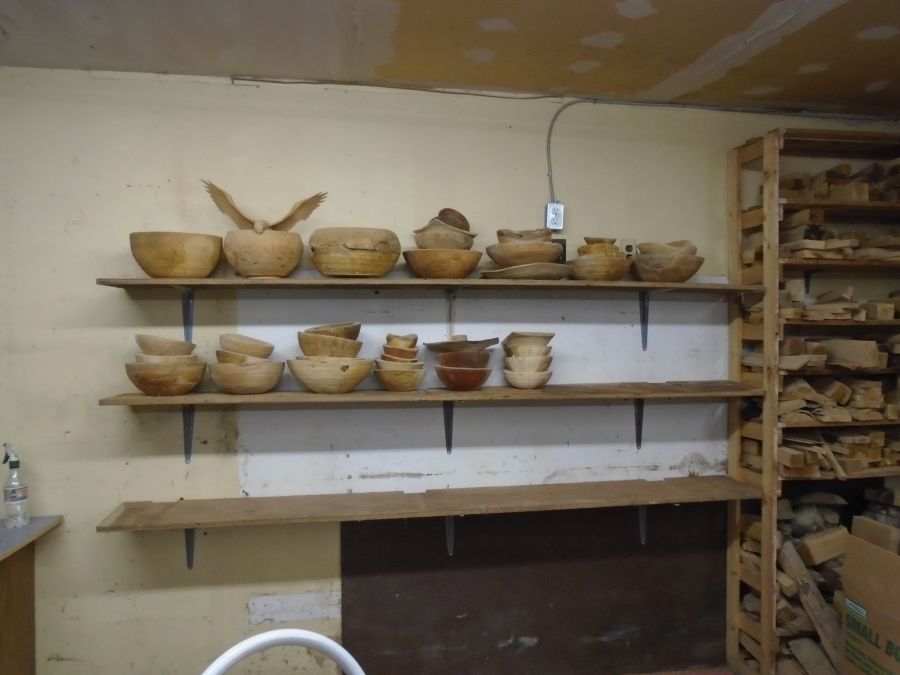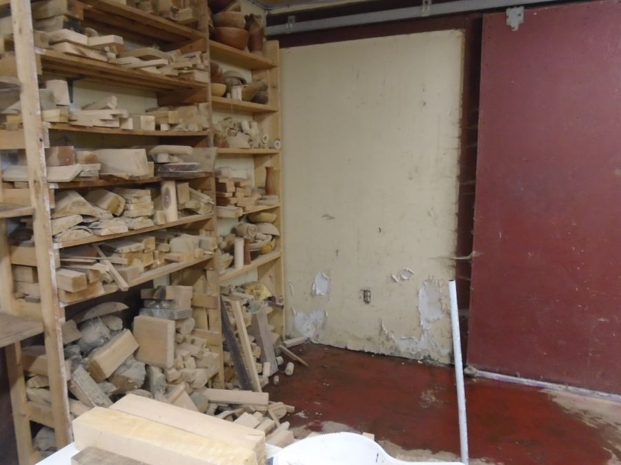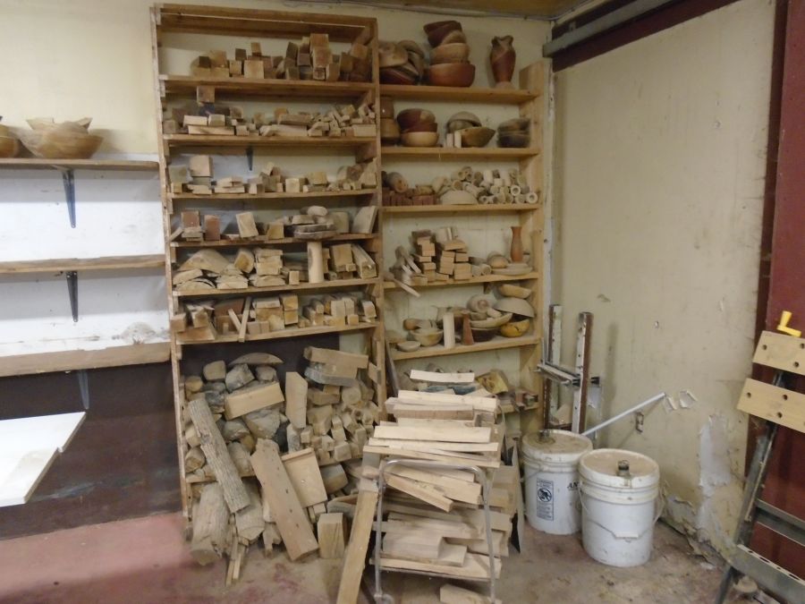 Looking at the shelves and the wet floor, I have decided to move the wood into boxes as before; long spindles, short spindles, blocks and firewood. Anything else can have a home on the table.
