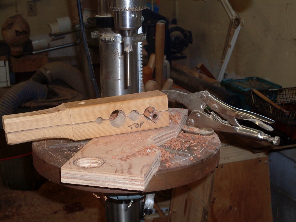 Out comes the holding jig once again as a pen trimmer is put into the drill press. I have the drill press set to 950 rpm which is its slow speed. A pen trimmer has a long shaft that just fits the inside of the brass rod. At the top is fastened a cutter which is larger than the diameter of the pen bushings and at 90° to the shaft. This will esure that the end of the blank will be square to the axis of the barrell and that the fittings will line up properly..