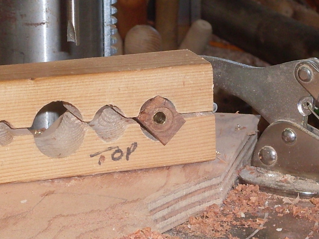 Again I leave the drill press speed at 950prm. I am sure that anything in this fairly low range will be fine. Some people mount a handle to the pen trimmer and use it that way but I find that this is efficient and works well. With the blank in the holding jig and the drill press turning, the trimmer is eased into the blank. The end of the trimmer clears glue that has dripped into the brass tube while the cutting edges come down to clear the glue at the end and square the wood to the tube. just touch the trimmer edges to the blank with an up and down motion until the rim of the tube shows bright all around the opening.