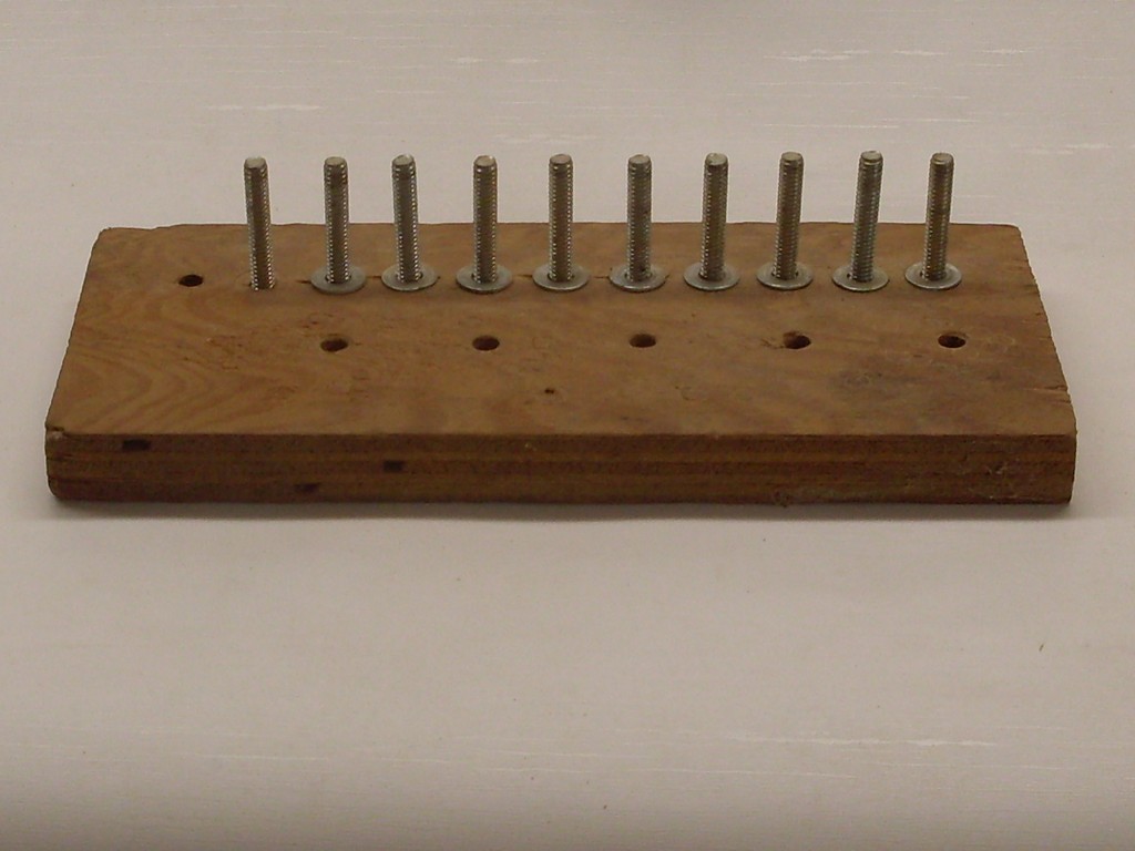 This is a jig I made about 20 eyars ago. It is just 10 1/4" bolts sticking up out of a piece of scrap plywoood with some washers for sturdiness. There are five holes partially drilled through the plywood, one in front of each pair of bolts. It will make more sense as I use it. This is not a necessary jig but it sure is useful considering I seldom make fewer than 25 pens in a batch.