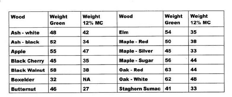 Here are the weights of some of domestic the woods I have turned. All weights are expressed per cubic foot and are taken from USDA Forestry information.