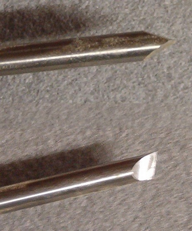 A while ago, I was at a demonstration given by Bod Rosand where he showed us how to make ball and icicle Christmas ornaments. He also showed us how to make the 1/4" round skew he used for the icicle. You just take an 8" long, 1/4" diameter round tool bit from Enco or elsewhere, insert into a handle and sharpen it. Here is a picture of the tip. This is my favorite tool for long and narrow spindles especially the icicle on Christmas ornaments.