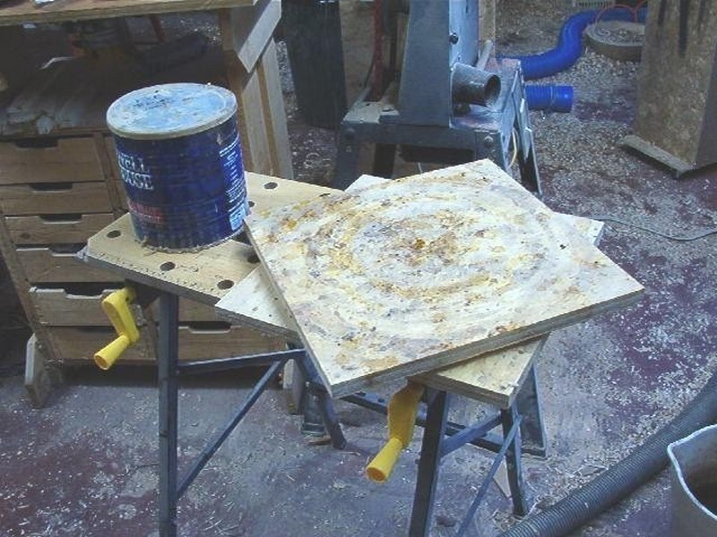 This is just two pieces of scrap plywood connected with lazy Susan bearing. I anticipated using it for finishing large items and seem to use it for almost everything, including putting roughed bowls on it for applying wax. You do not have to worry about the surface and it makes it easy to swing around to all sides.