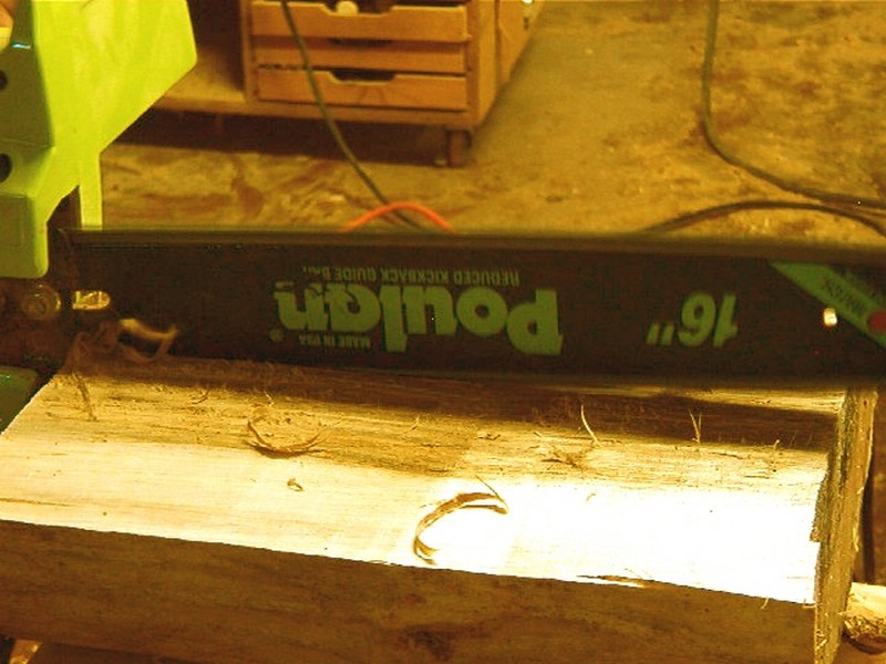 While it has nothing really to do with bowls, this has a lot to do with going from log to lathe. I tend to do a lot of spindle turning, especially for craft shows, so I have decided to cut the other half the log into 3/4" thick boards for spatulas. To start with, I cut the half log down the center with the chain saw. By the way, the saw bar is on correctly. Chain saw bars are symmetrical and I like to flip it every now and then for even wear. I am not sure if it is worth it but I have been doing it for almost fifty years and would have trouble changing now.