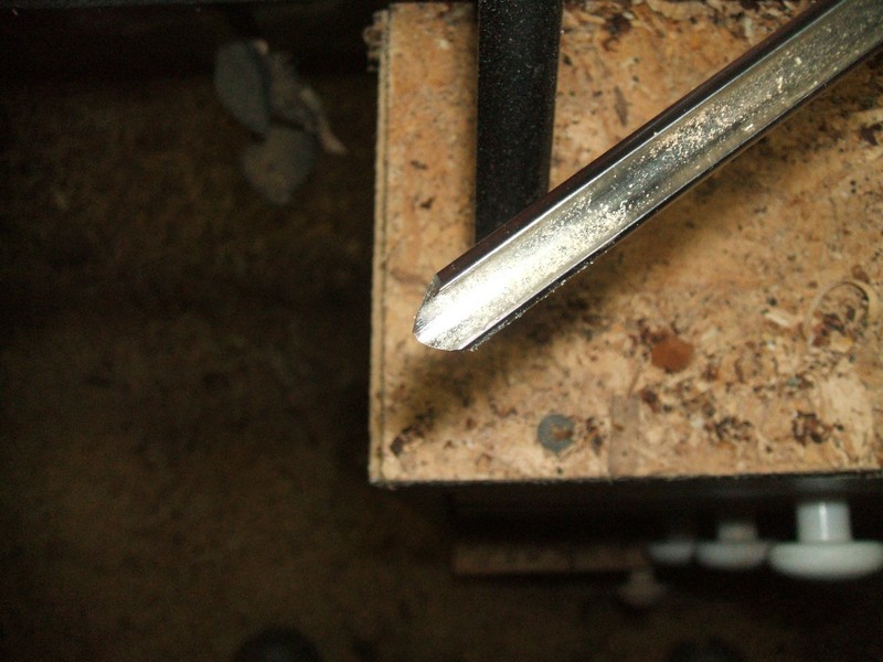 To start hollowing, even through a huge opening like this one, I like to drill a center hole to define depth and give an area to cut from center out to the side. For this I like to use a 1/4" bowl gouge. It is sharpened at 45° and fairly straight across. I do this free hand although you can use the jig the same as a roughing gouge for the same effect. With the tip away from you and the flute up, the left side is given a couple of touches on the grinder and the right one. This leaves a point in the middle. What is left is a sort of gun drill.