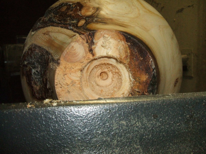 The bowl gouge so used can be used to work its way gradually out to the side and in fact, as a friend of mine does, could be used to hollow this entire piece. However, aside from the center drilling, I like to use hollowing tools in an arm brace.