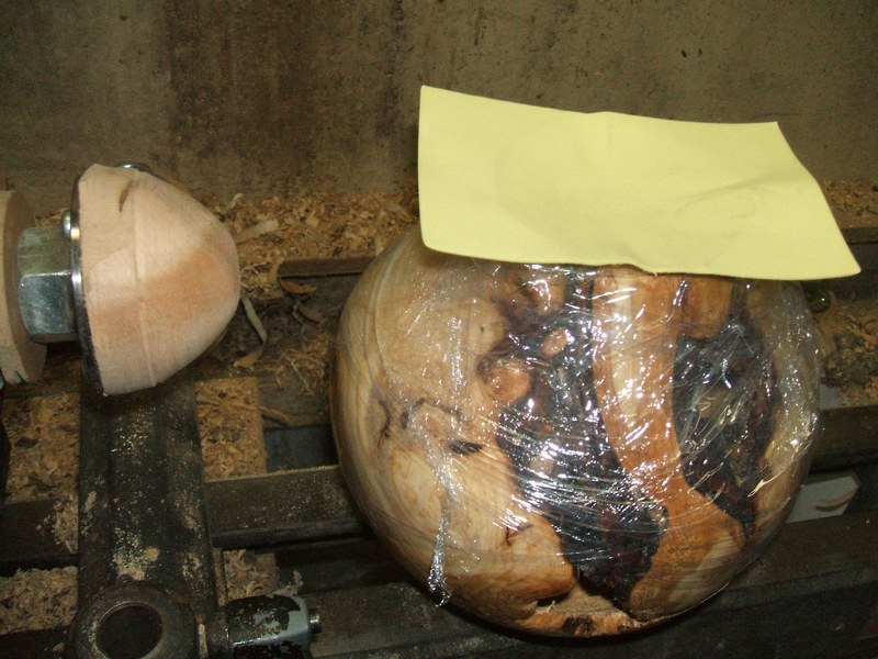 Remembering the weakness of the neck due to that included branch, I now need to strengthen it temporarily. Ideally, I could wrap it with strong tape such as Duck tape or fiberglass reinforced tape, but that would leave a residue of adhesive which is awkward to remove and might even pull some wood away as it was removed from the burl. Instead I gave it several wraps of the clear cellophane tape that is used to tie pallet material. This is non-adhesive and sticks only to itself. It is also easy to find at most hardware stores these days.