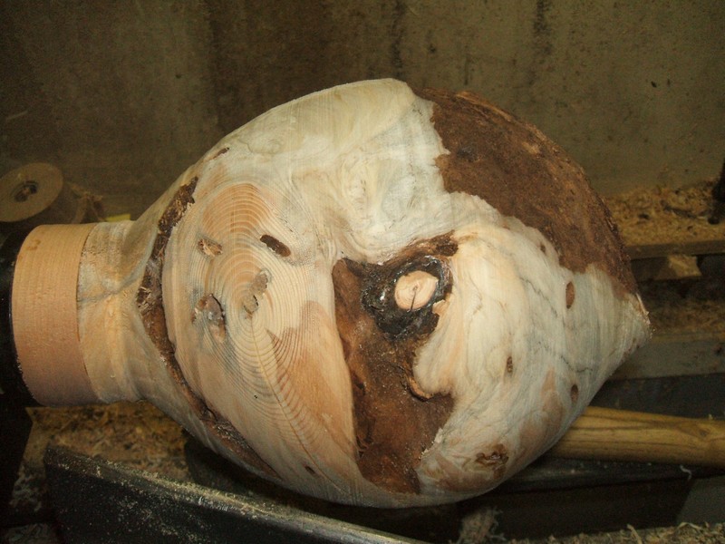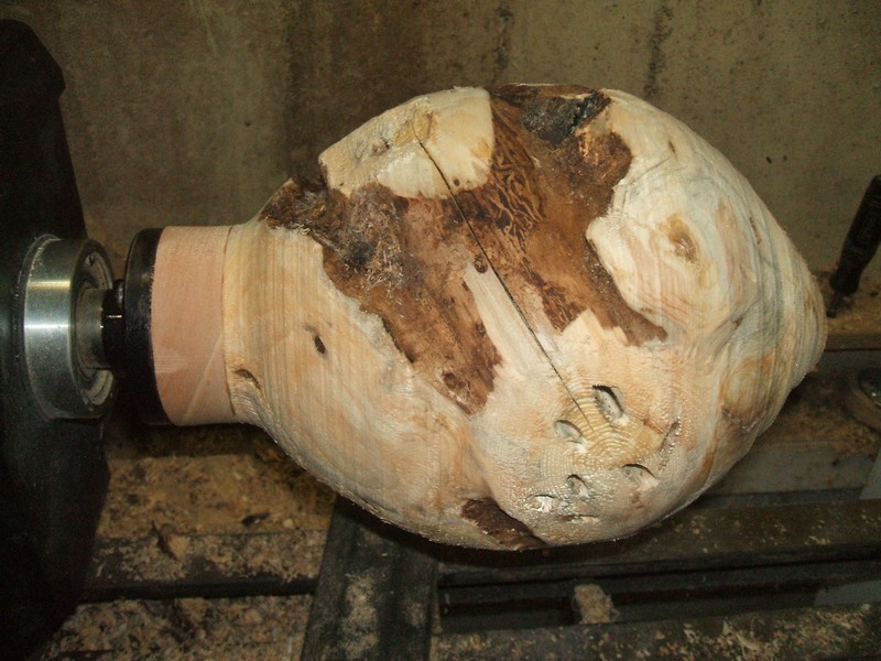 There remains a fair amount of wood to come off this burl. A couple of chain sawn areas can be seen and the shape needs to be refined. Some of the concave sections will break through into holes or "negative space" and others will leave dark areas of contrast.